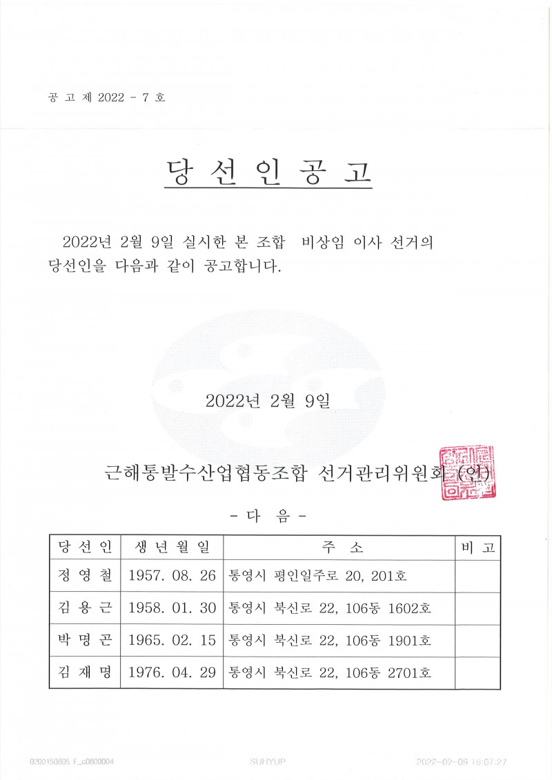 2022년 근해통발수협 임원(비상임 이사) 당선인을 붙임과 같에 공고 합니다.